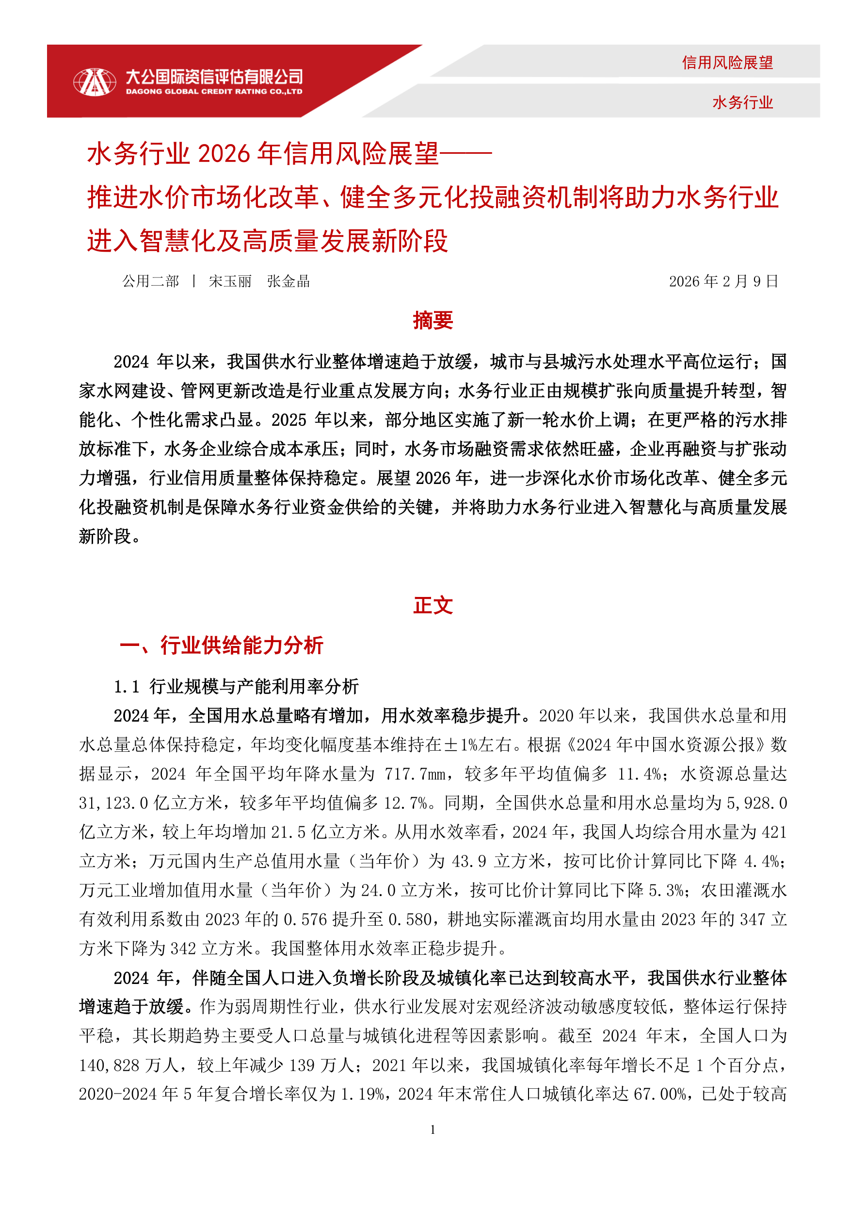 水务行业2026年信用风险展望:推进水价市场化改革....