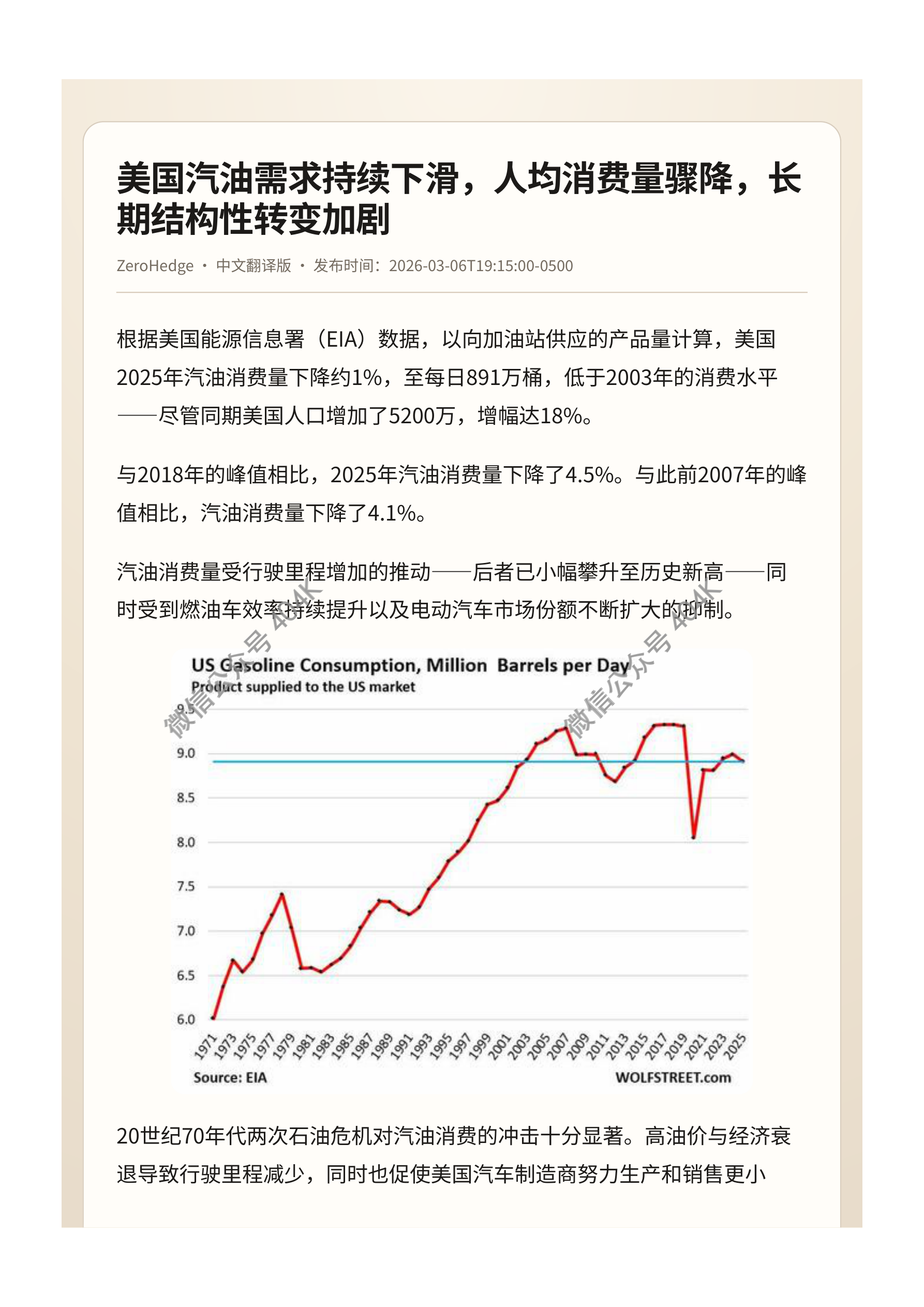 美国汽油需求持续下滑,人均消费量骤降,长期结构性转....