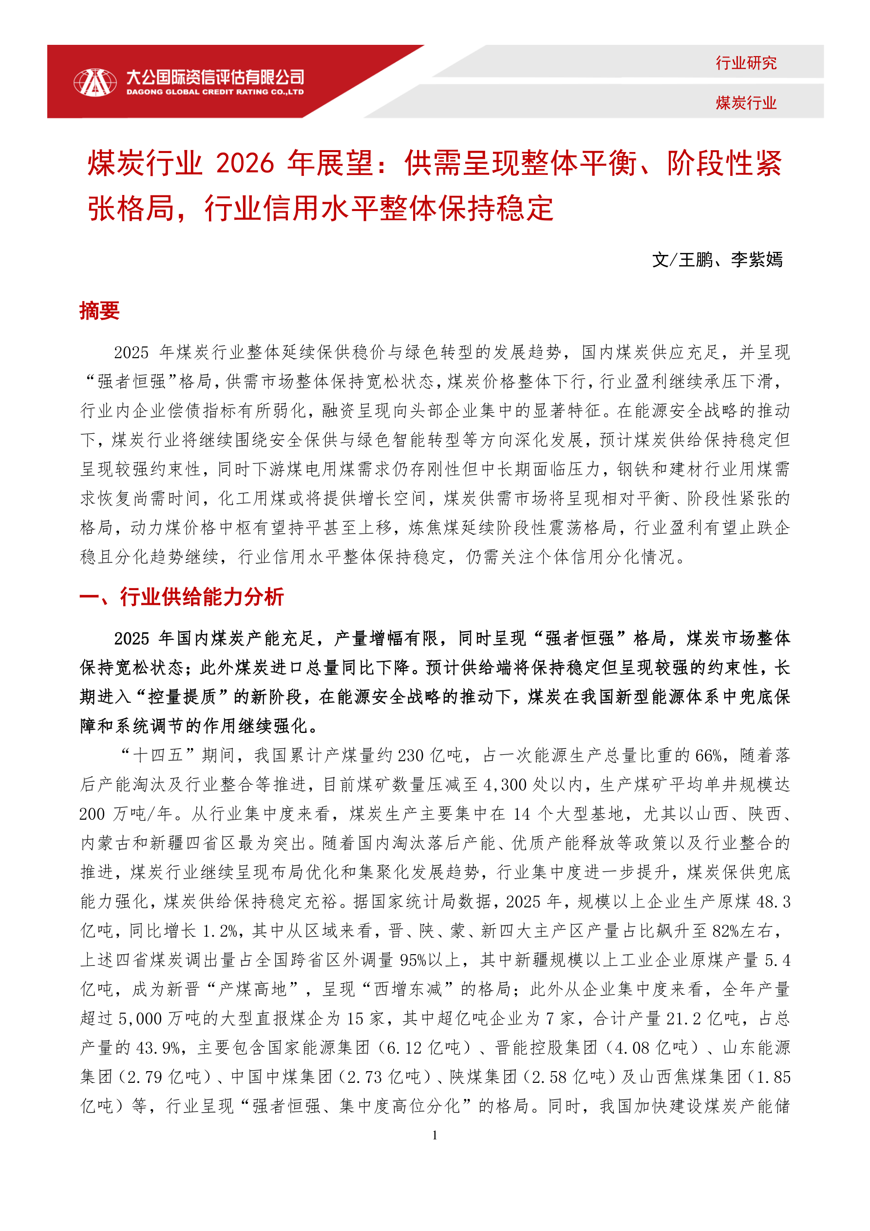 煤炭行业2026年展望:供需呈现整体平衡、阶段性紧....